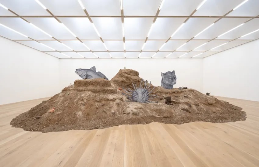 A mountain of soil, ceramics and huge black-and-white aluminium prints dauntingly welcomes the viewer at Nottingham Contemporary. The newly commissioned installation by Claudia Martínez Garay entitled “WAKCHAKUNA / We Who Share Everything and Nothing” is built at the centre of an otherwise common white cube exhibition room with natural light coming from the ceiling. The mountain itself invites the viewer to discover its treasures, but also intimidates. Once visitors let their curiosity take over and walk around, the large prints are discovered to be fragmented, just like the ceramic objects partly visible and partly hidden in the soil.