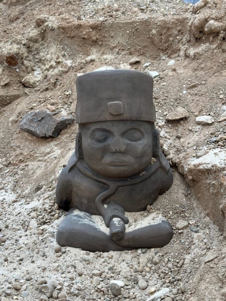 An example of a widely misinterpreted series of objects is also presented in the installation: namely, piece 10 “Woman and Skeleton Pottery”. The vessel is made in the form of a skeleton and a woman embracing. The skeleton is gripping the woman’s bottom lip, while the woman is holding the skeleton penis. This ceramic vessel is part of a unique subset named “sex pots”, which depict human figures in a wide range of sex acts. Contemporary interpreters may assume that they were designed to be erotic if not pornographic. However, the presence of a skeleton aids in understanding the artwork’s meaning. Archaeologists have found these pots in high-society tombs, and suggest that these were not erotica. In pre-Columbian Andean religious life, ancestors were paramount: as skeletons do not have erect penises, the depiction of this organ symbolises fertility and therefore the power and legacies of ancestors.[1]