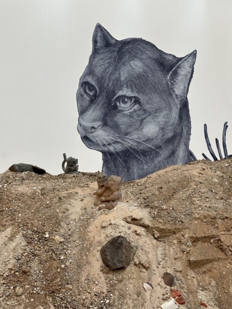 The mountain is envisaged as a sacred safe space for these objects, as a place of belonging, where they are guarded by non-human creatures, here represented through the giant prints: an otter, a cojinova fish, a spondylus shell and a wild jaguarundi cat.